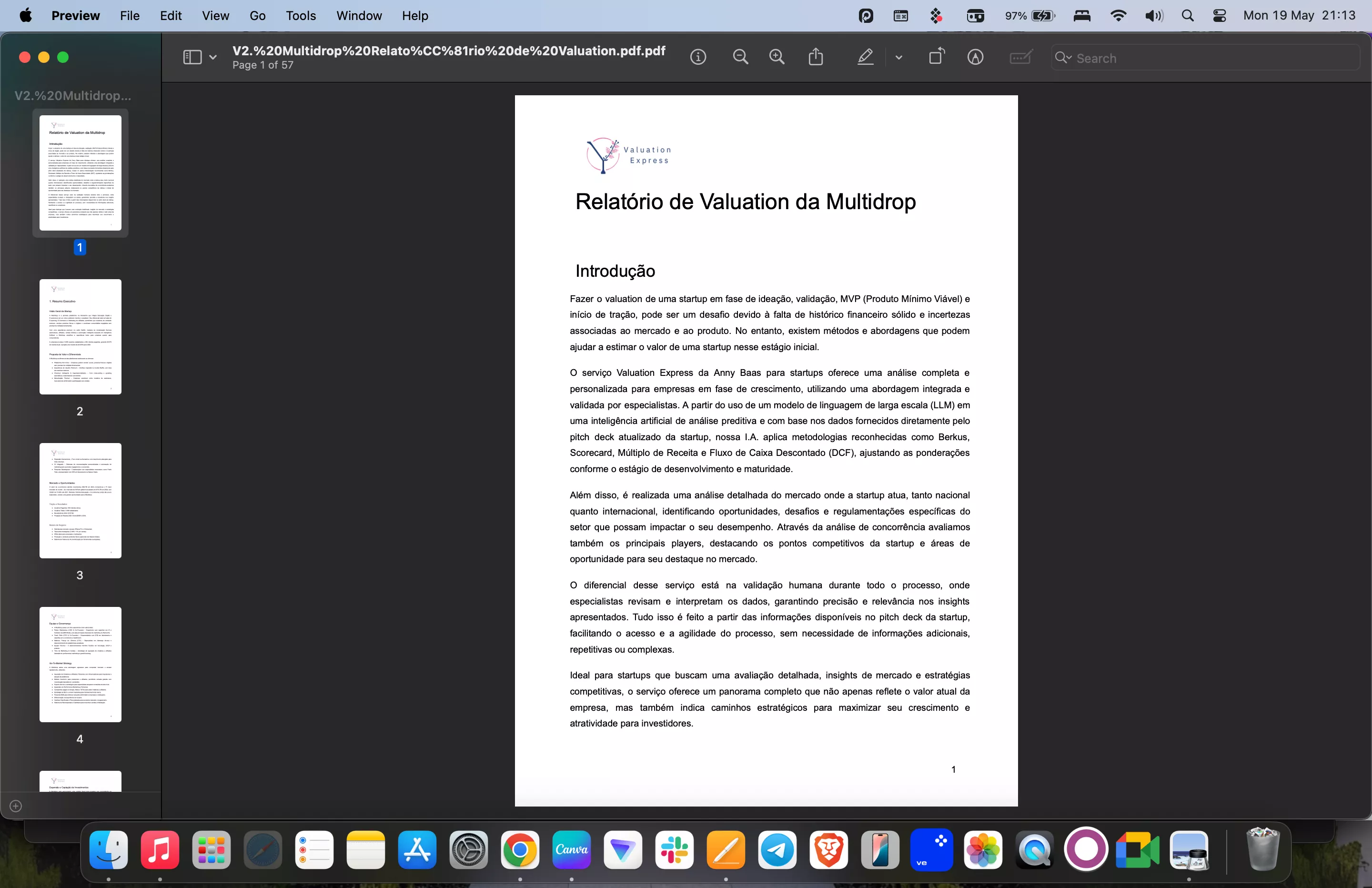 Transforme seu Pitch Deck institucional em um relatório completo e profissional de valuation com análise de mercado, benchmark e insights estratégicos. Conquiste investidores e negocie rodadas de funding com dados concretos.